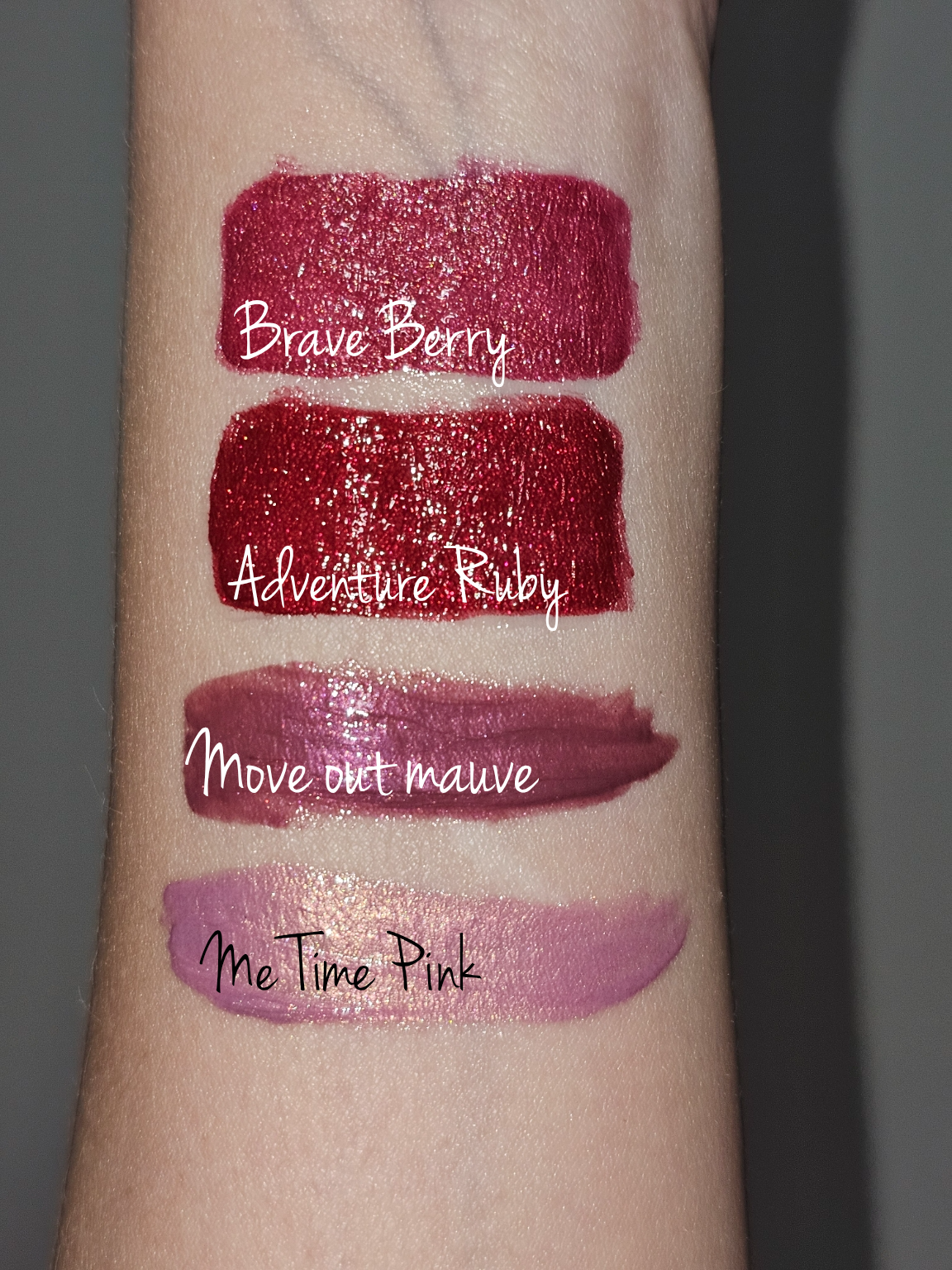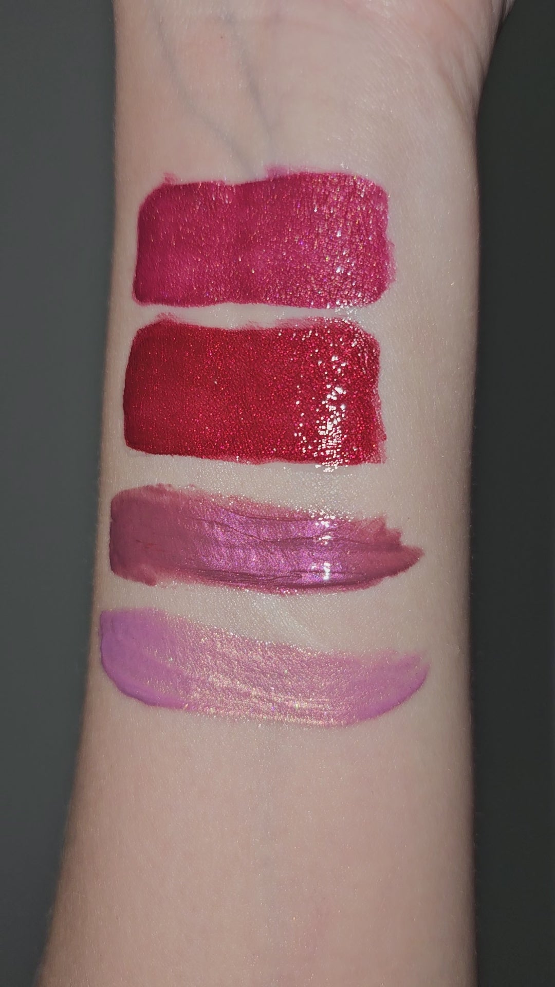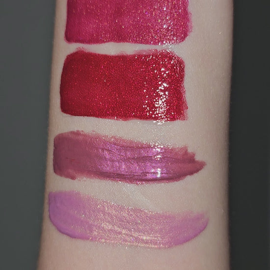 Cool toned mega shimmery medium ruby red.