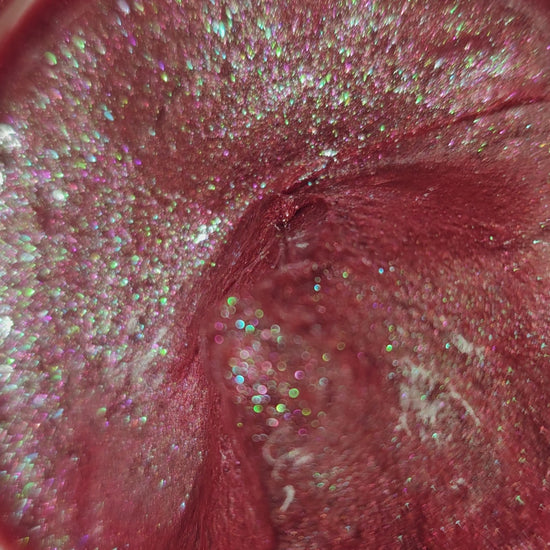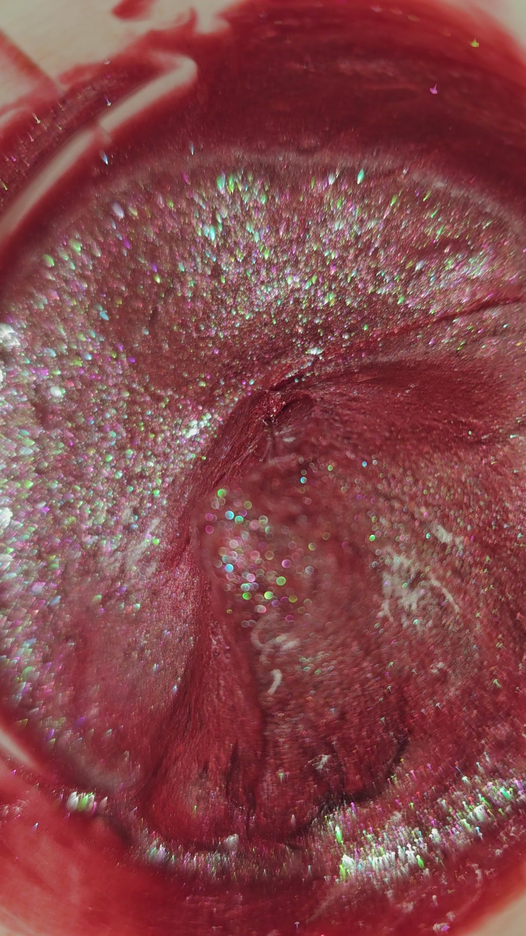 Semi sheer warm toned red with iridescent green and pink shimmer.
