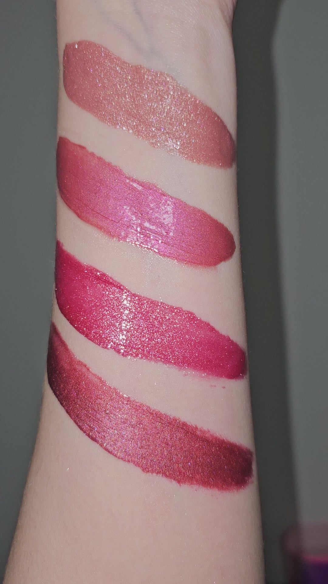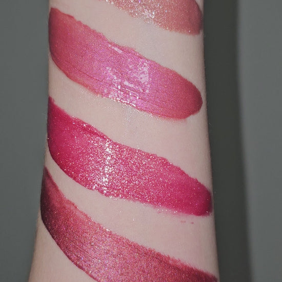 Cool toned shimmery maroon pink with red and brown undertones.