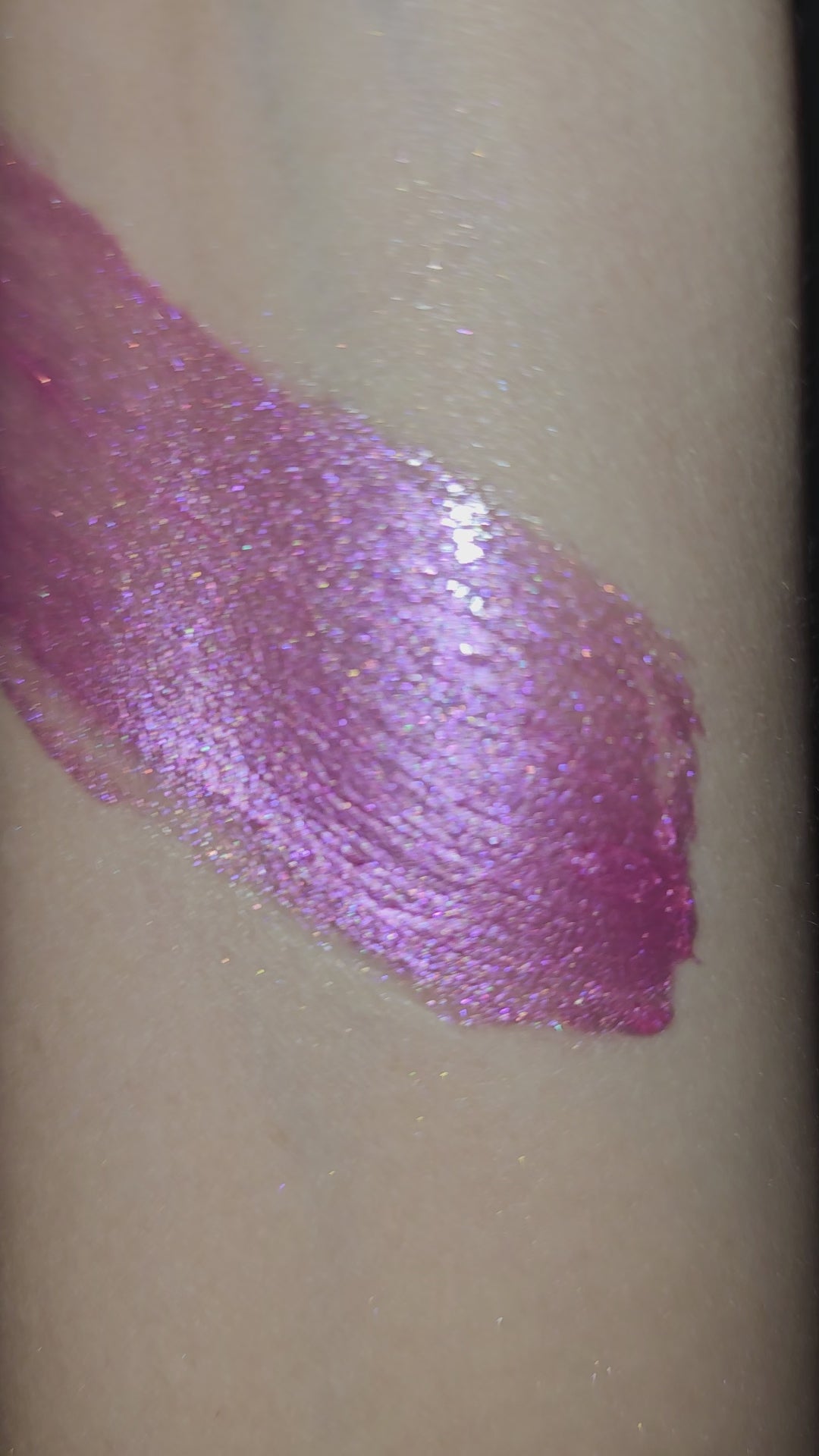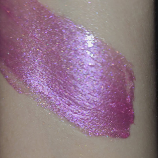 Cool toned semi sheer bubble gum pink with purple sparkles and a metallic finish.