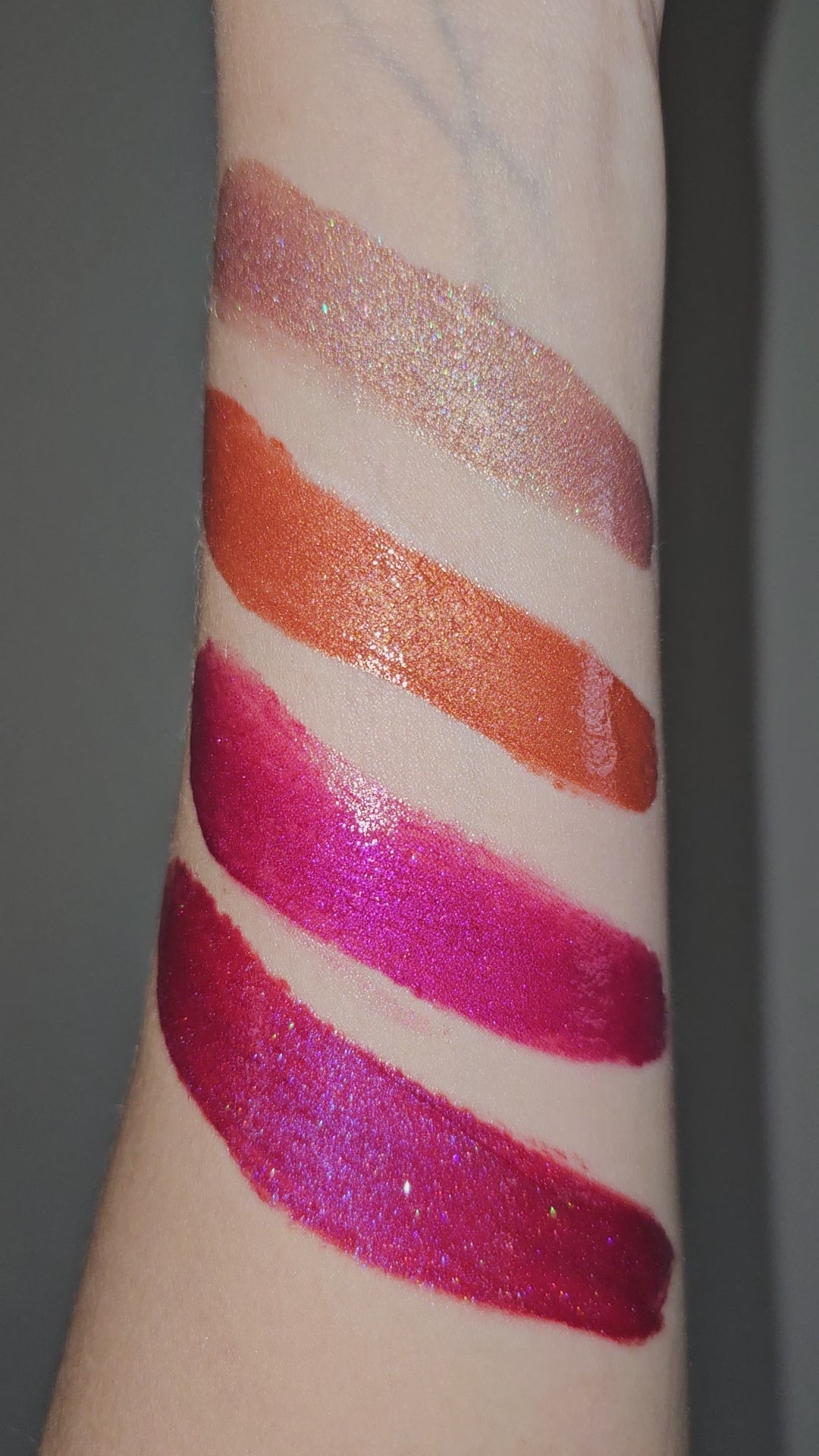 Cool toned bold magenta with purple sparkles and a velvet look finish.