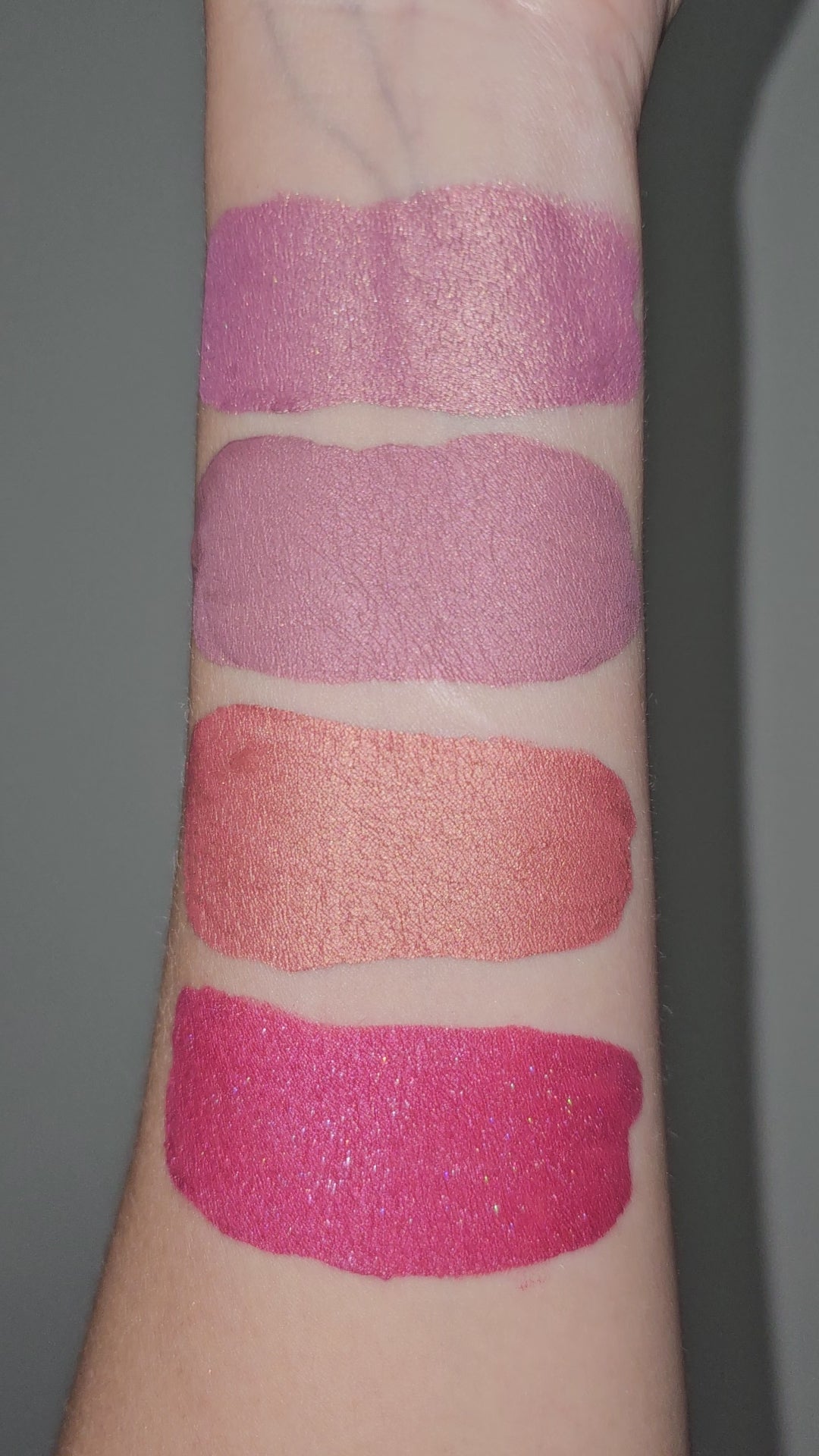 Warm toned peachy pink with a metallic rose gold finish.